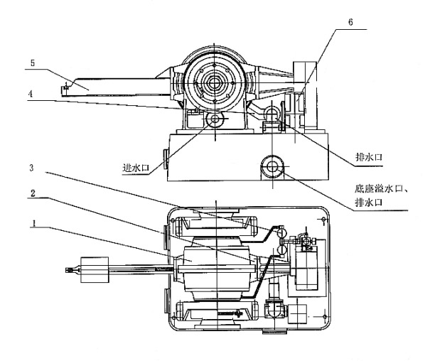 外殼上開有排水孔,左右軸承外殼開有進(jìn)水孔,以保證低溫水的進(jìn)入與高溫水的排出。左右軸承外殼都有一溢水管,甩水圈甩出的水經(jīng)溢水管進(jìn)入底座后排出。