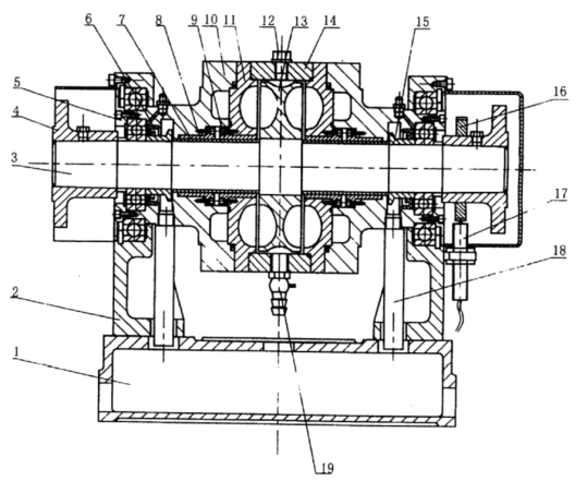 1、底座  2、左右軸承座  3、主軸部件  4、聯(lián)軸節(jié)  5、軸承壓板  6、骨架油封 7、軸套  8.9、雙金屬軸套  10、左右軸承外殼  11、左右側(cè)殼  12、螺塞  13、轉(zhuǎn)子 14、外殼  15、封水圈  16、測(cè)速齒輪  17、轉(zhuǎn)速傳感器  18、溢水管  19、旋塞