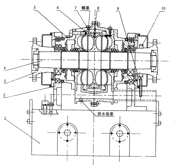 1、底座 2、軸承座  3、聯(lián)軸節(jié)  4、主軸部件  5、軸承殼  6、外殼   7、側(cè)殼  8、轉(zhuǎn)子  9、轉(zhuǎn)速傳感器  10、測(cè)速齒輪
